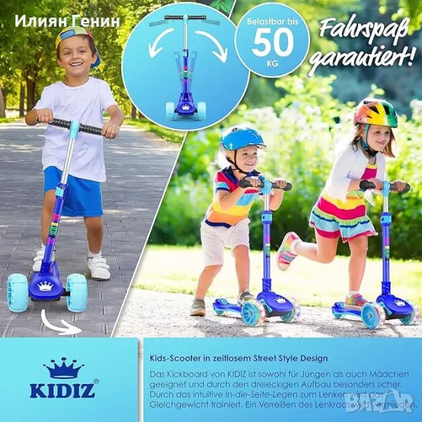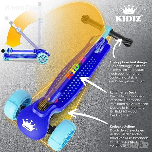 Устойчив и издръжлив: тротинетката е изработена от висококачествена пластмаса и метал и има подсилвания на дъното, кормилното управление и спирачката. Скутерът издържа до 50 кг. Кикбордът е подходящ както за момчета, така и за момичета. Тротинетката от Kidiz е особено стабилна и безопасна благодарение на триъгълната конструкция и по този начин предпазва от инциденти.