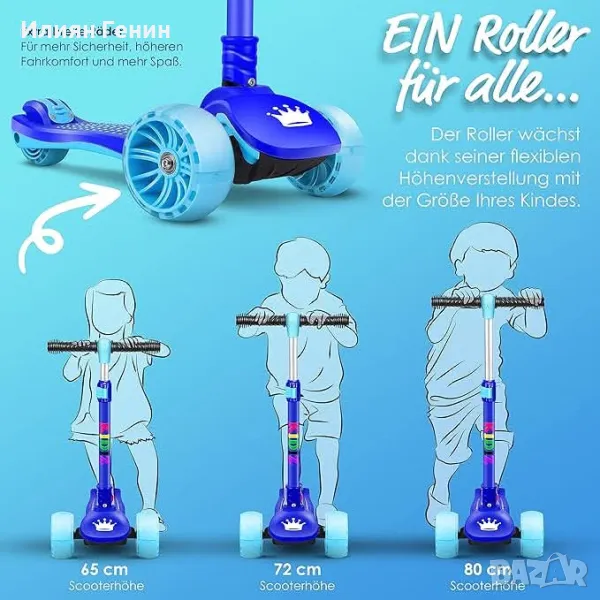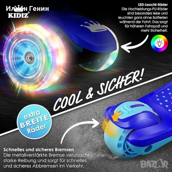 Забавление при шофиране с комфорт: изключително широките колела не само осигуряват високо ниво на комфорт при шофиране и повече забавление, но също така са особено тихи и светят или мигат - без батерии - по време на шофиране. Гарантирано удоволствие от шофирането и още повече безопасност благодарение на високата видимост - върху различни повърхности като павета, трева, асфалт, бетон или дървени подове. Големият борд на тротинетката осигурява стабилност - дори и за начинаещи.
