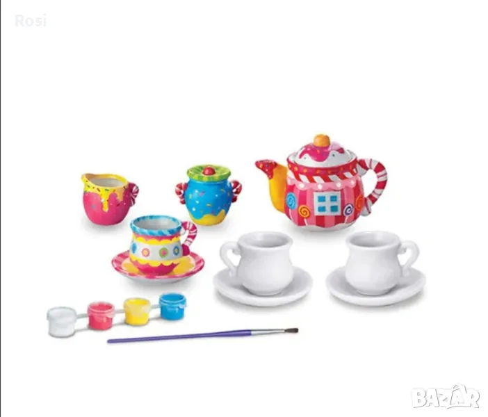 Оцвети по свой дизайн сервиз за чай с оригинални мотиви и любимите ти цветове! Организирай чаено парти за своите кукли или го използвай за украса за дома! Комплектът съдържа:• Комплект от 1 чайник, 4 малки чашки и чинийки, 1 каничка за чай, купичка за захар, четка за боядисване и боички. • Инструкции на български език!Подходяща за деца над 8 годиниРазмерите са между 3 и 6 см височина.Цветовете и съдържанието на комплекта може леко да се различават от илюстрираните на опаковката.