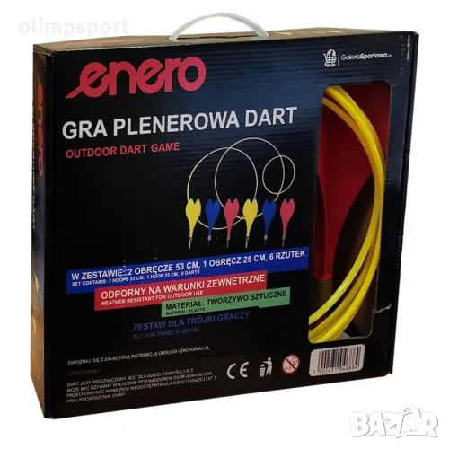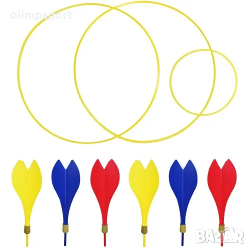 Дартса е предназначен за игра за всякакви открити и закрити пространства. Стрелите за дартс са по два броя в три цвята, което дава възможност за игра на трима души едновременно. Комплектът включва два обръча с диаметър 53 см, един обръч с диаметър 25 см. и шест броя обезопасени стрели за дартс с пластмасови върхове. Диаметър обръчи - 53 см, 25 см. Дължина стрела - 29 см. Тегло за комплект - 800 г. Размери кутия - 36.5х32х10 см. Материал - PVC