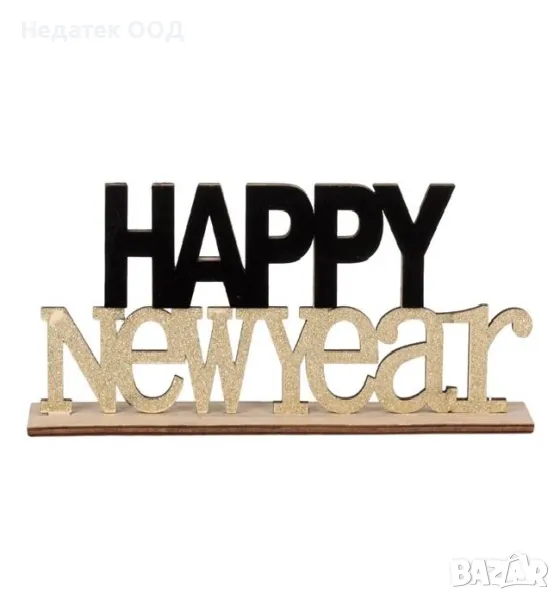 Коледен декоративен дървен надпис Честита Нова година с черно кадифе и блясък в цвят шампанско. Дайте на къщата най-празничния образ!