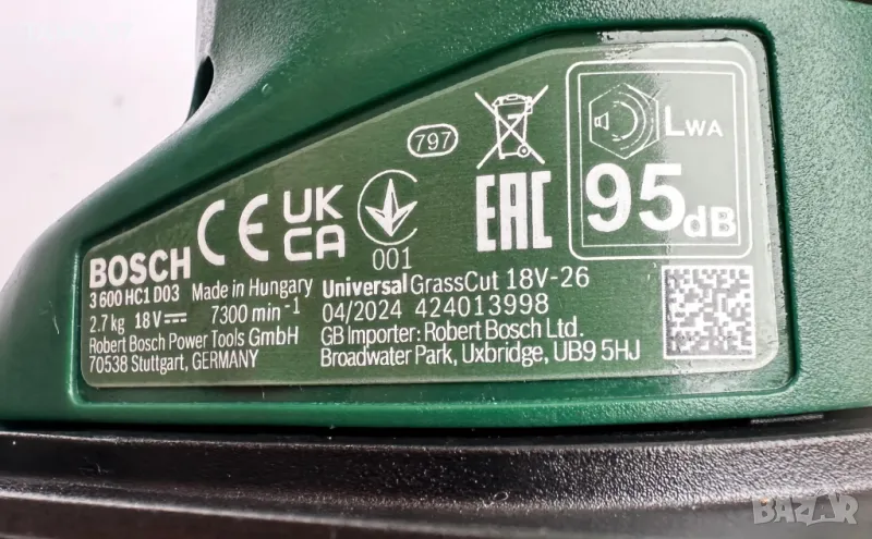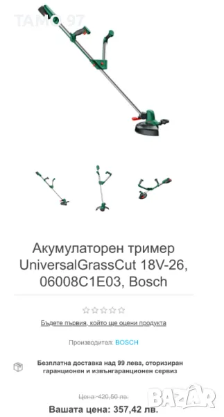 акумулаторен тример на Бош който никога не е използван, както се вижда на снимките. Има една забележка по корпуса където се случи при транспорт счупено парче по корпуса оградено с червено на 5-та снимка, което не му пречи на работата и не играе никаква роля. Оригинално унгарско производство от 2024г. внос от Франция. Обявената цена е за само машината без батерия и зарядно, при желание на клиента може да се добави използвана батерия и зарядно и цената ще е 220лв.