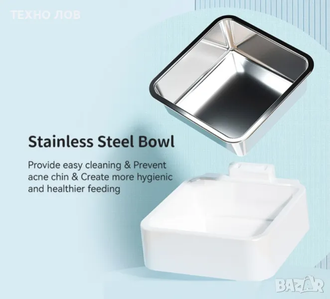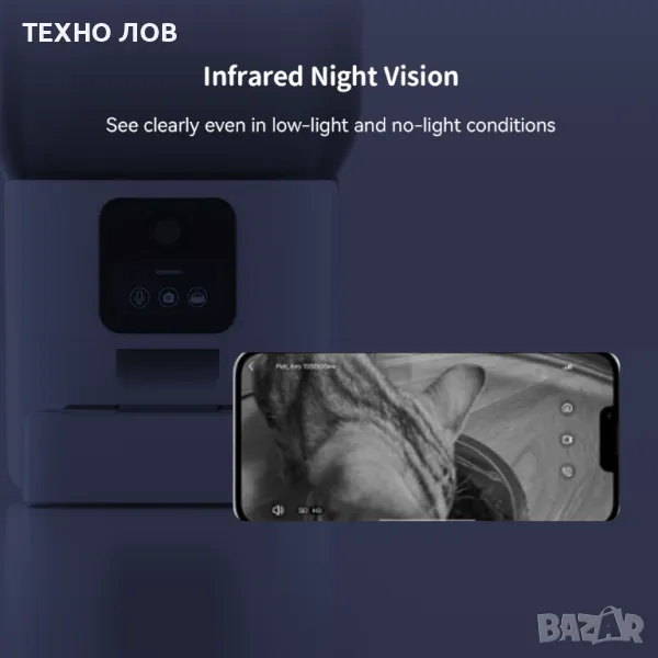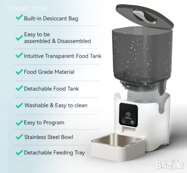 хранилка за кучета и котки е иновативно устройство, което ще улесни грижата ви за домашните любимци. Свързва се с Wi-Fi връзка и дистанционно управление с вашия телефон, хранилката предлага удобство и гъвкавост при храненето на вашите любимци. Автоматичната хранилка за кучета и котки поддържа два източника на захранване, захранващия адаптер на 220 волта и 4 батерии, ако спре тока, вашият домашен любимец няма да остане гладен.Хранилката разполага с голям капацитет на храната и разделителни отделения, които могат да съдържат суха храна. Това ви дава възможност да предоставите на вашите кучета и котки разнообразна и добре балансирана храна в предварително зададени порции. С помощта на приложението, което можете да инсталирате на своя смартфон, можете да контролирате хранилката от разстояние. Можете да настроите график за хранене, да промените порциите и да следите консумацията на храна от вашия домашен любимец.
