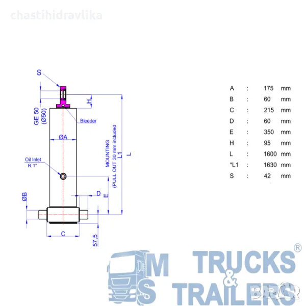 За монтирането на този Хидравличен цилиндър са необходими допълнителни елементи - горна стойка (47000026) и долен комплект стойки (47000017), които се заплащат отделно. Цена при запитване.