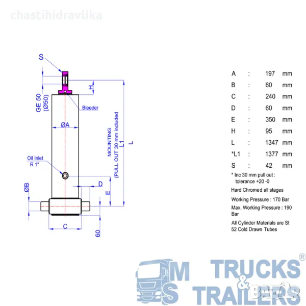 За монтирането на този Хидравличен цилиндър са необходими допълнителни елементи - горна стойка (47000026) и долен комплект стойки (47000017), които се заплащат отделно. Цена при запитване.