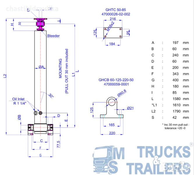 За монтирането на този Хидравличен цилиндър са необходими допълнителни елементи - горна стойка (47000026) и долен комплект стойки (47000017), които се заплащат отделно. Цена при запитване.
