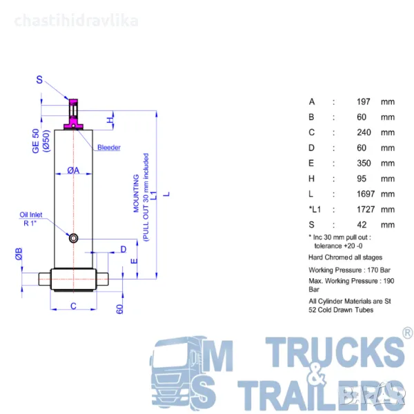 За монтирането на този Хидравличен цилиндър са необходими допълнителни елементи - горна стойка (47000026) и долен комплект стойки (47000017), които се заплащат отделно. Цена при запитване.