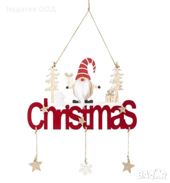 Коледна декоративна дървена табела с бордо кадифе, джуджето на Дядо Коледа с подаръци, златни блестящи детайли и висящи на въже звезди и снежинка. Дайте на къщата най-празничния образ!