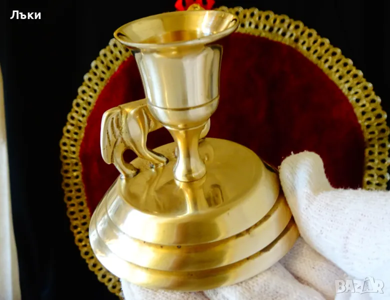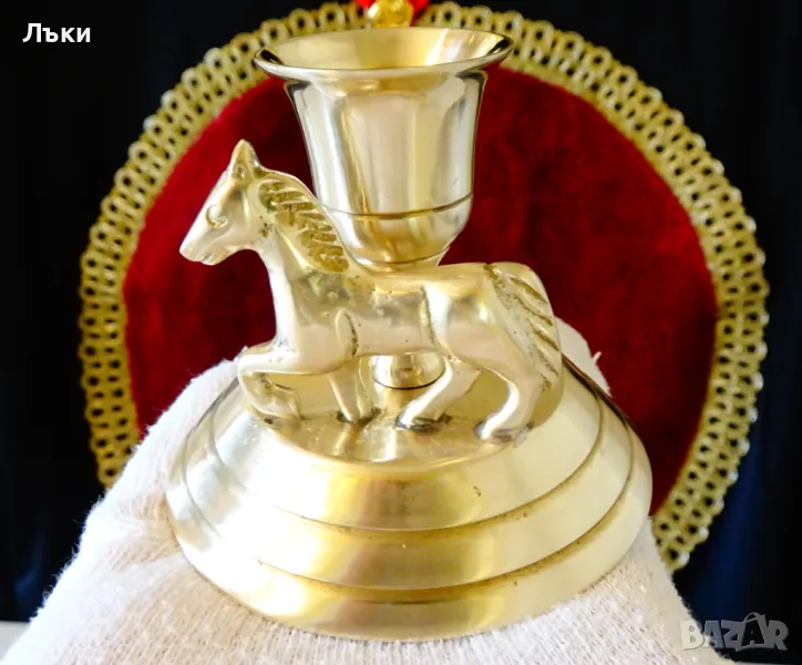 изработка от масивен бронз.Пред свещника на същата основа има красиво изваяна фигура на Кон.Уникално и функционално дизайнерско решение,съчетано с блясък на
