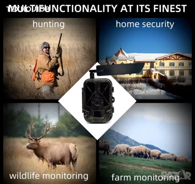 ловна камера, фотокапан. Камерата работи с приложение на Suntek Cam. Когато вече е вкарана в приложението камерата започва да изпраща снимки и видео при засичане на движение. Този модел камери се отличава с това, че може от телефона да се гледа видео в реално време. Освен това при засичане на обект изпраща известие със снимка или видео /зависи от настройката която сте задали/. Камерата е снабдена с вградена презареждаща литиевойонна батерия 8000mАh. Много лесни и бързи настройки. Настройките и пускането на камерата става за минута. Приложението е напълно безплатно за Аndroid и IOS телефони. Когато вече вкарате камерата в приложението на телефона може да правите всякакви видове настройки дори камерата да не е при вас. Също така може да чистите картата с памет от приложението без да се налага да ходите до камерата. Може да се наблюдава от неограничен брой хора.