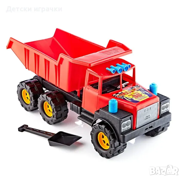 Голям детски камион - тип самосвал,в комбинация от светли и забавни цветове. С подвижна каросерия и механично задвижване. Изработен от пластмаса без остри ръбове.