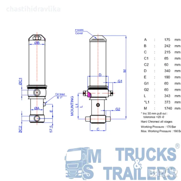 За монтирането на този Хидравличен цилиндър са необходими допълнителни елементи - горен комплект стойки (47000024) и долен комплект стойки (47000121), които се заплащат отделно. Цена при запитване