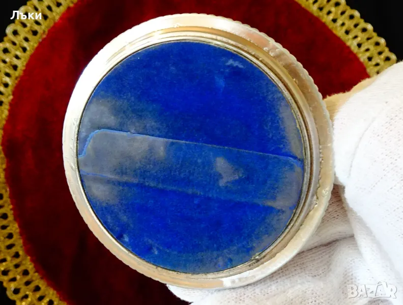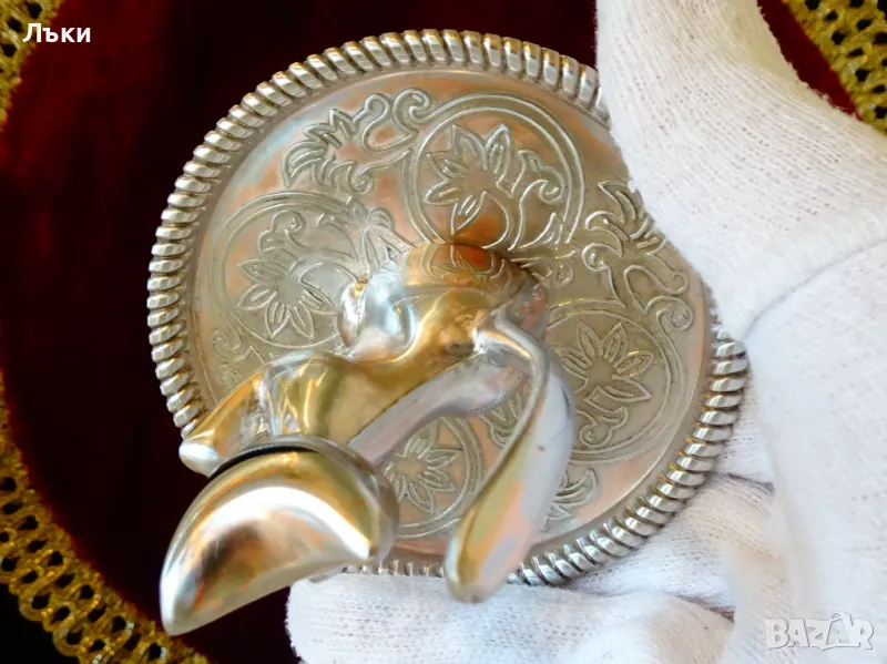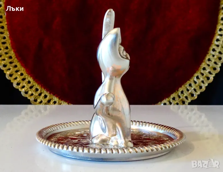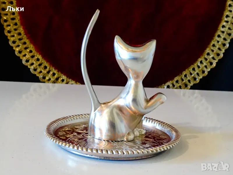 Котка,изработена от посребрена мед.Основата е декорирана с релефни орнаменти.Височина 8 см.,диаметър 8 см.,тегло 130 гр.