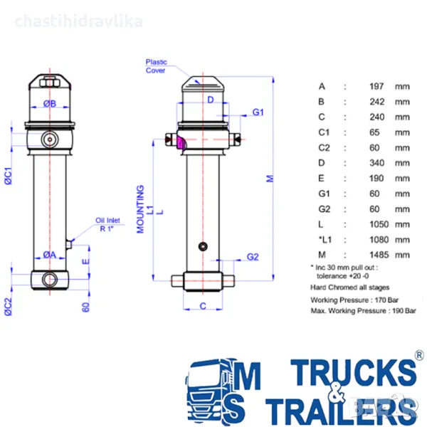 За монтирането на този Хидравличен цилиндър са необходими допълнителни елементи - горен комплект стойки (47000024) и долен комплект стойки (47000121), които се заплащат отделно. Цена при запитване