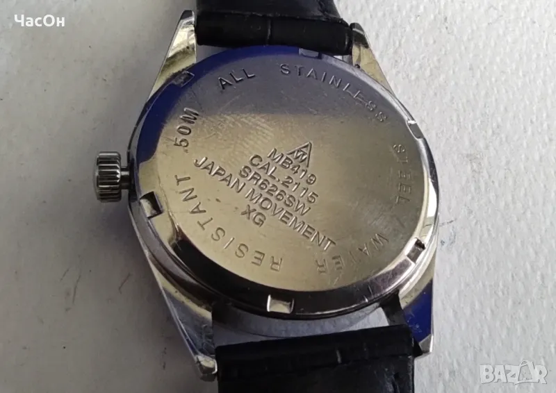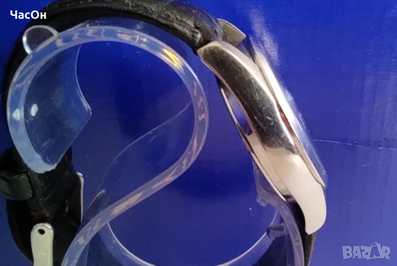 ринг на циферблата, с разграфени минути. Показва час, минута, секунда, дата. Датникът работи нормално. Не се сменя на при полуизтеглено положение на коронката. Часовникът е с японски кварцов механизъм калибър 2115. Работи много точно. Батерията е нова, качествена. Капакът е на винт. Следите от употреба са малки, забележими само от близо. Снимките са правени така че да личат, но реално не се открояват. Часовникът е красив и стойностен, който го поръча, няма да остане разочарован.Размери: широчина на корпуса – 36,1 мм, с коронката – 38,5 мм, дължина с лъговете – 43,5 мм, дебелина – 10,5 мм.Тегло с каишката – 52,7 гр. Каишката е оригиналната, плътна, от естествена кожа, реновирана, в отличен