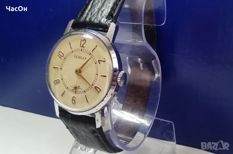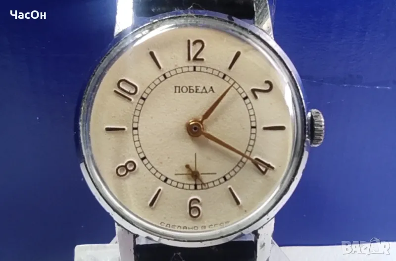часовник ПОБЕДА от 80-те години. Въпреки възрастта от около 40 лета, добре запазен и работещ точно. Разбира се по корпуса има следи от употреба, но не са натрапчиви и само отблизо бият на очи. Снимките умишлено са правени от много близо, за да е представата, все пак, реална, но в действителност следите по корпуса не са така забележими.
