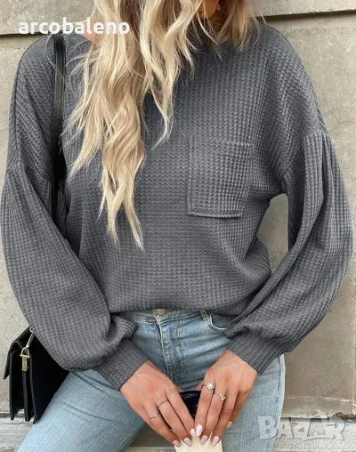 Материал: Този дамски плетен пуловер е изработен от мека и дишаща смес от полиестер и памук, осигуряваща комфорт и издръжливост.
