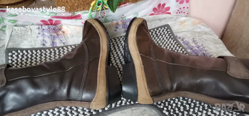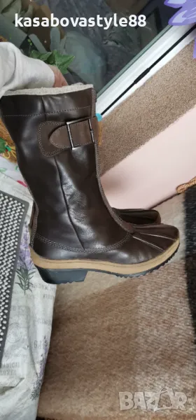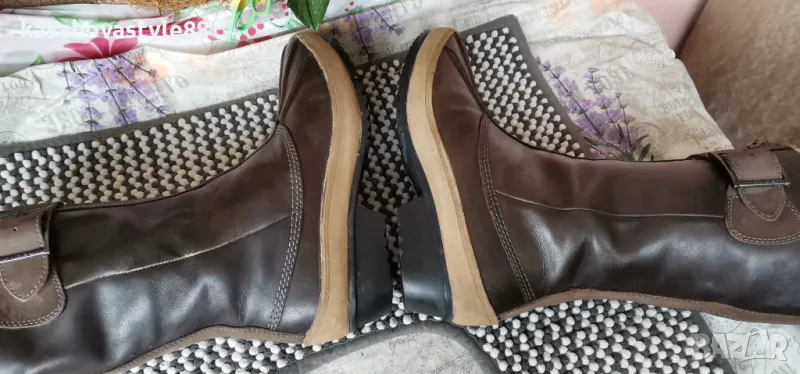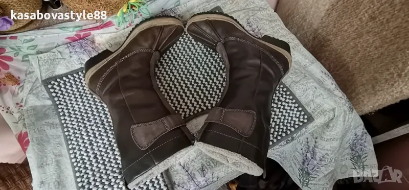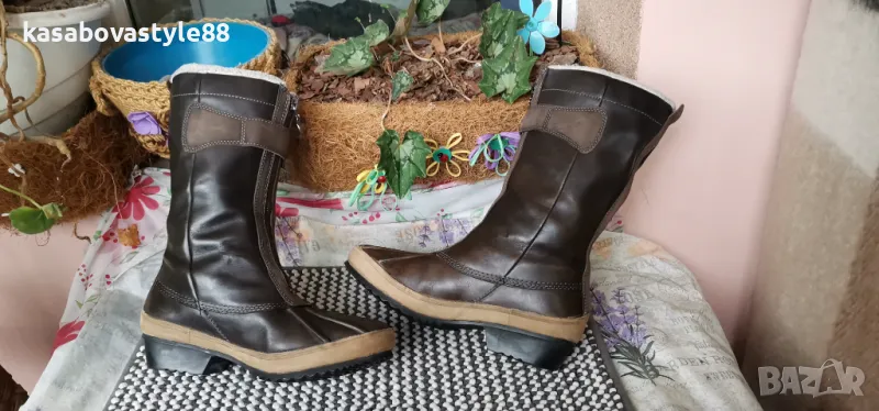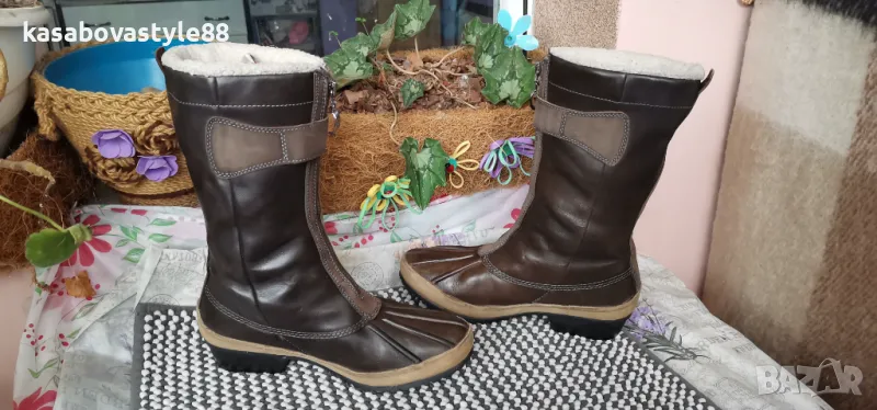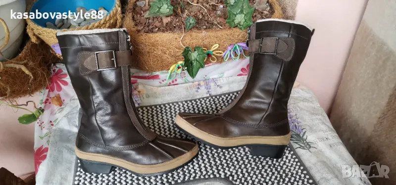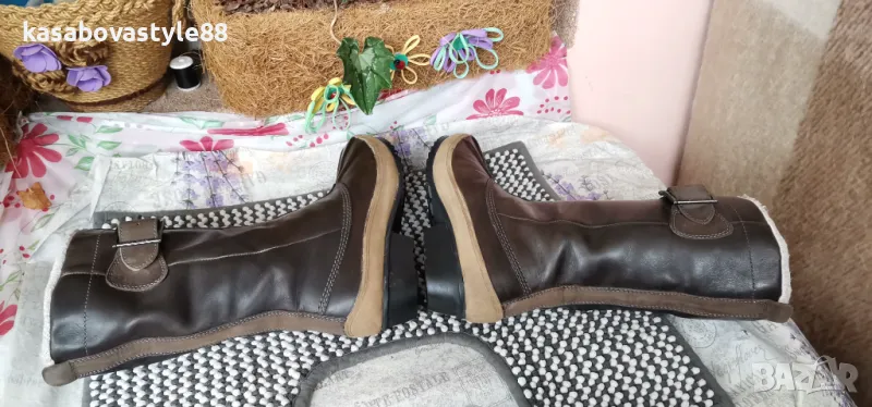 Ботушките са в топ състояние! Външната част е изработена изцяло от естествена кожа в кафяв цвят. Отвътре са с топла подплата. Моделът се обува с помощта на ципове и катарами за регулиране на ширината. Отговарят на 39 н. Дължина на стелка 25.3см.Цялостна височина отзад 30см.Ходило 3см.