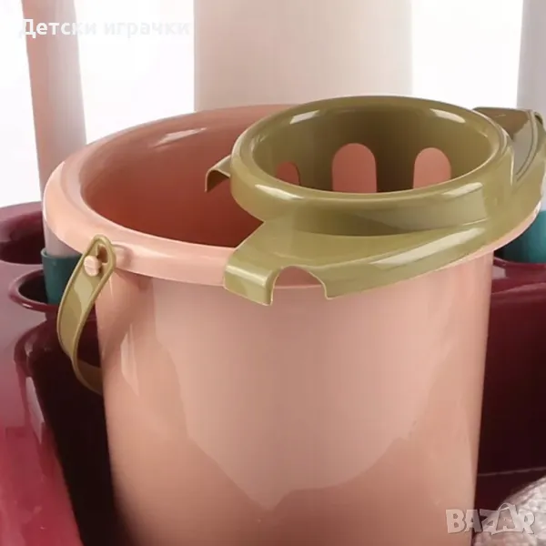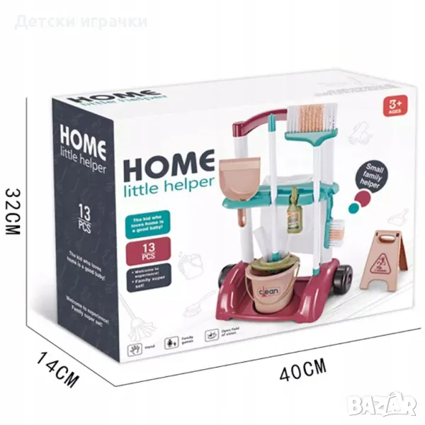 - кофа за моп, моп и четка с бели дръжки и зелена метла с кофа за боклук. Найлонова торба за боклук може да се окачи на специални държачи в задната част на количката. Допълнение, което вашето дете ще хареса е стойка с предупреждение за хлъзгав под.
