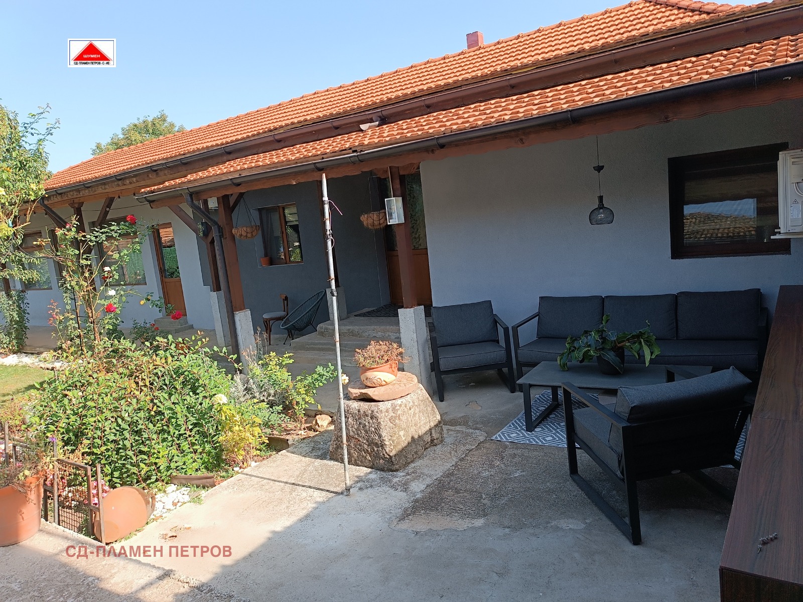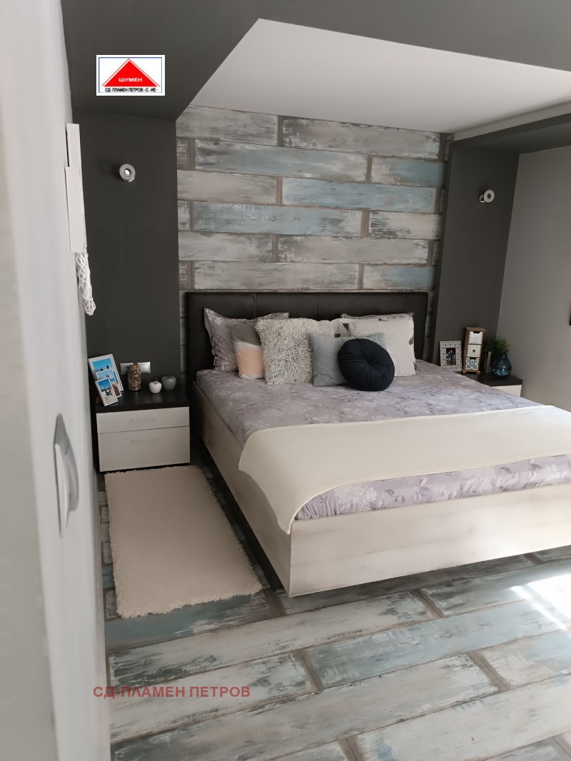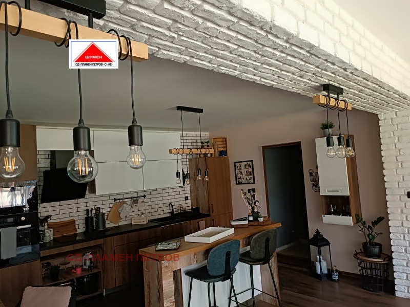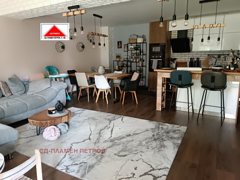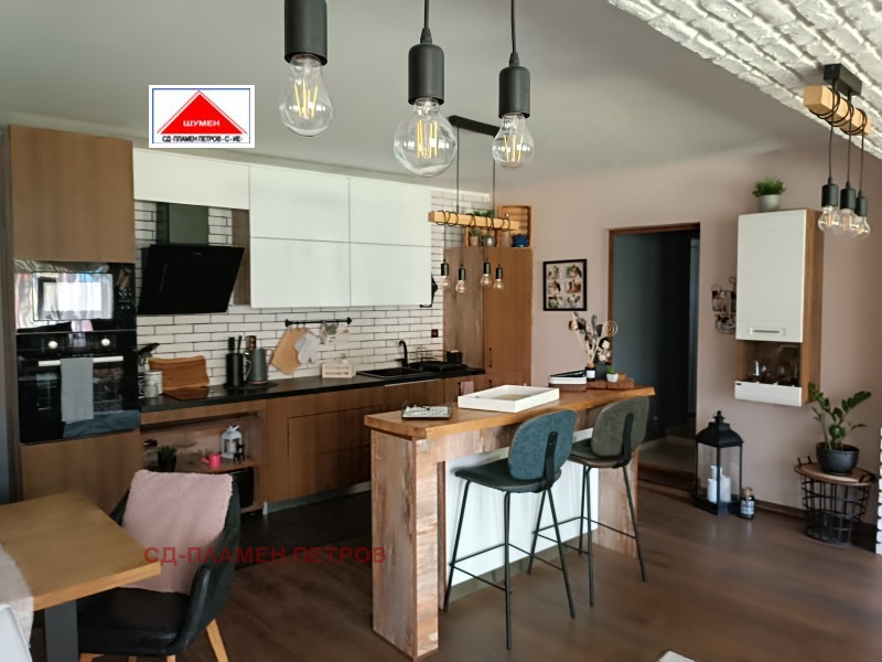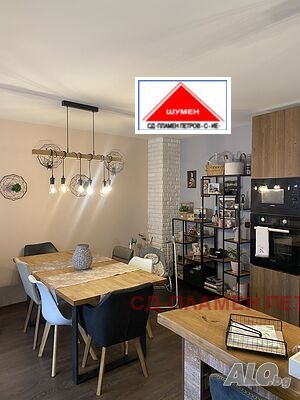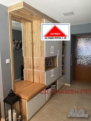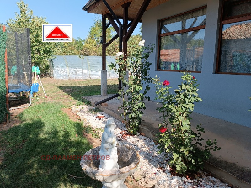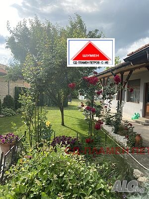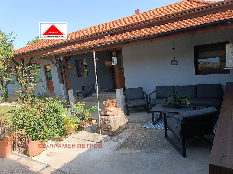 ПРОДАВАМЕ МОДЕРНА ЕДНОЕТАЖНА КЪЩА в с. Панайот Волово на 7 км от град ШУМЕН с прекрасен докориран двор с овошки и цветна градина .Разположението на къщата се състои от входно антре с две спални вътрешен коридор с отделни баня тоалет и перално помещение просторен хол с кухня и остров. Къщата има три входа и възможност за още две спални помещения, разполага със маза гаражна врата с две паркоместа. Къщата се продава обзаведена и оборудвана.