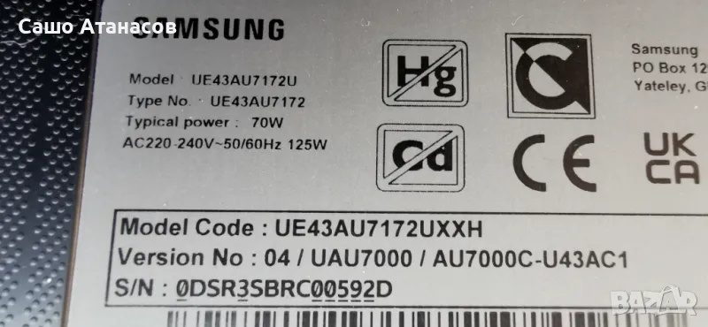 SAMSUNG UE43AU7172U със счупена матрица ,BA43FA130 ,BN9650989D ,WCT730M ,CY-BA043HGER1V