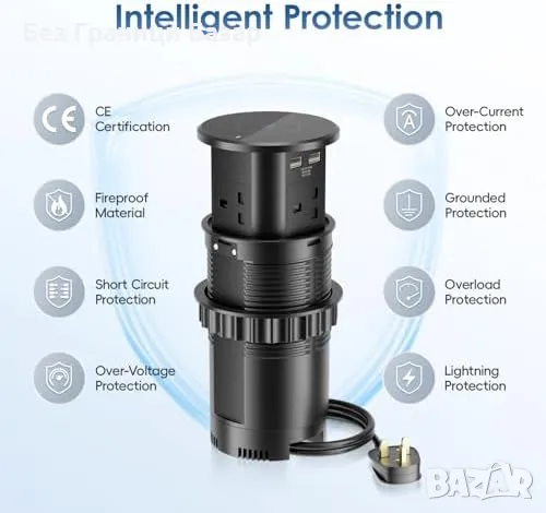 Множество портове: 8 контакта (4 UK), 2 USB-A, 2 USB-C с бързо зареждане QC 18W и PD 20W.