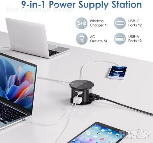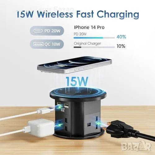 Нов Компактен разклонител за бюра и кухни с 15W безжично зареждане