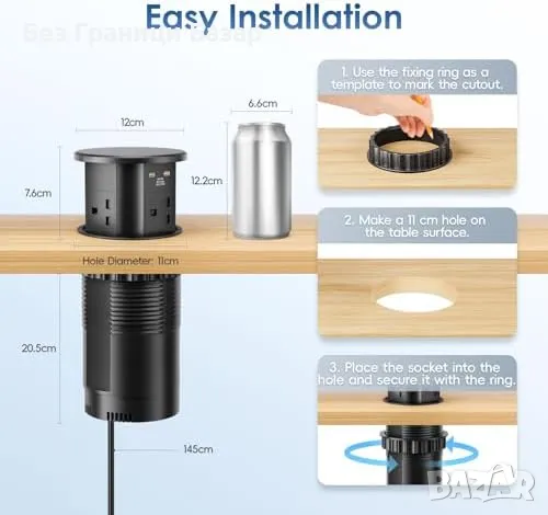 Лесен монтаж: Регулируема височина (0-76 мм) и отвор с диаметър 11 см за лесна интеграция.