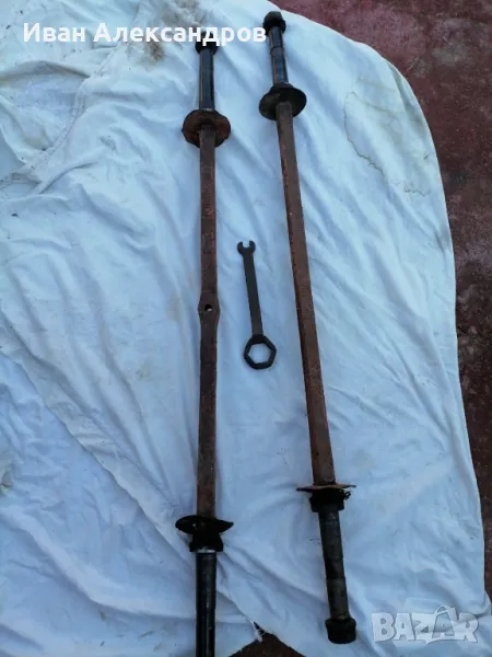 * две оси за каручка и ключ за гайките- 30 лв/бр за осите и 30 лв за ключа* перфектна люлка за каруца, дължината на дъската е 75 см. Цена 50 лв* ок за каруца за чифт коне. Изработен от бряст, в добро състояние, дължина около 320 см. Цена 60 лв