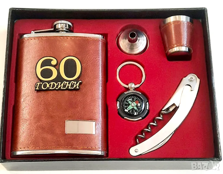 Флашка / манерка за алкохол с чашка, ефектно декорирани с кафява кожа, фуния, комбиниран нож с отварачка, тирбушон и компас-ключодържател .