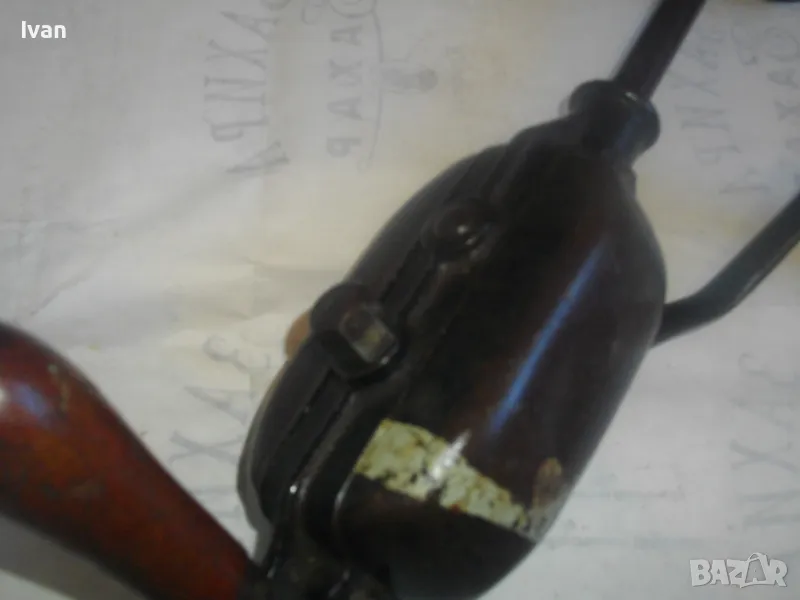 ОПИСАНИЕ на ръчна дрелка бормашина - маткап. Старо качество, немско производство. В отлично техническо/работно състояние. Запазен външен вид, без липси. Масивен, от големите размери. Захват патронник - 1,5 - 13 мм. Дължина на инструмента с рамото - 42 см, дръжка странична - оригинална с дървено покритие, без забележки. Лост въртене - оригинален, с дървено покритие, без забележки. 2 скорости. Метален масивен корпус, метално подпорно рамо. Дължина рамо - 12 см. Въможност за поставяне на дръжката от двете страни ляво-дясно. Тегло на инструмента - 3,0 кг. Към него е поставена нова немска голяма бургия свредло. Цена на маткапа голям 13 мм - с рамо - 129 лв.