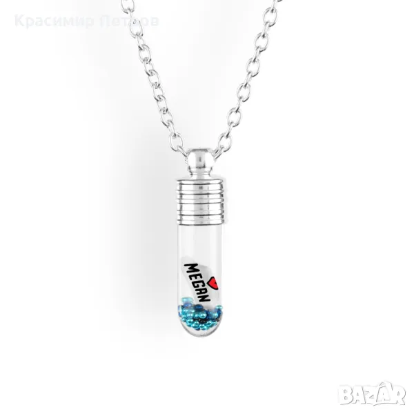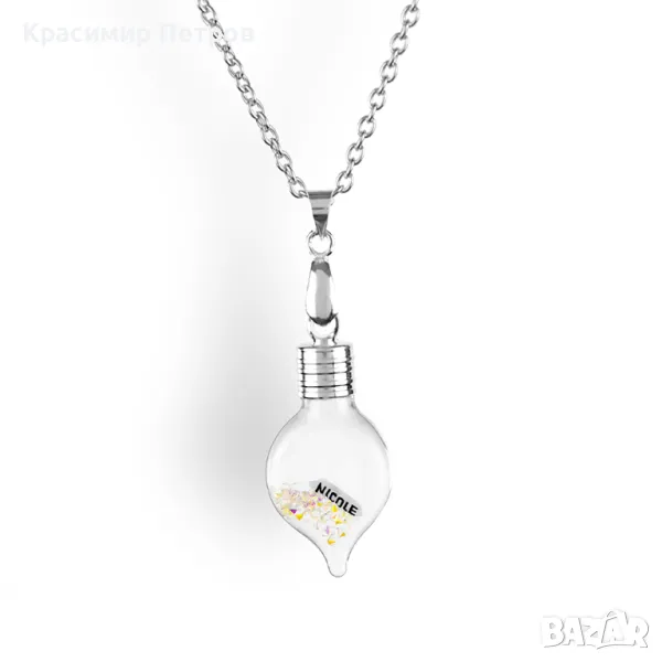 2. КОЛИЕ с име изписано върху оризово зърно в ампула, закачена на посребрено синджирче - 15€ (29,34лв).