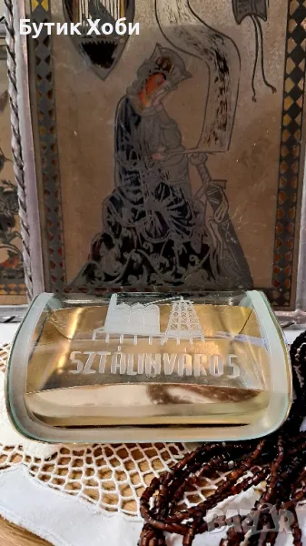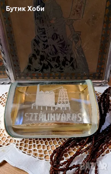 Винтидж нестандартна бижутерка ,, Stalinvaros,, от времето на соца, произведена в периода 1951- 1961година. Точно през тези години новопостроения град в Унгария е бил с това име - Сталинварош ( сега Дунайварош) Подобно на българския Димитровград, той е създаден по време на индустриализацията в Унгария след Втората световна война и е ,,кръстен,, на Сталин. Достатъчно рядък екземпляр е и би могъл да влезе в музея на соца :) Изработена от метална сплав и стъкло. Размери - 13×9,5×5.К // 3