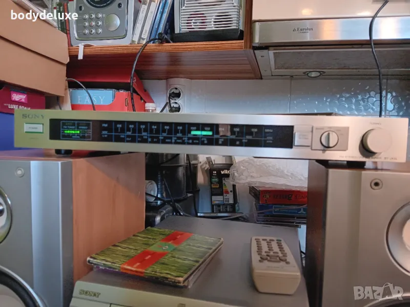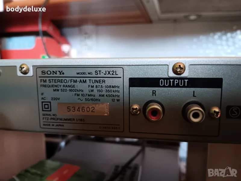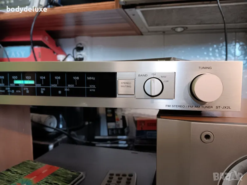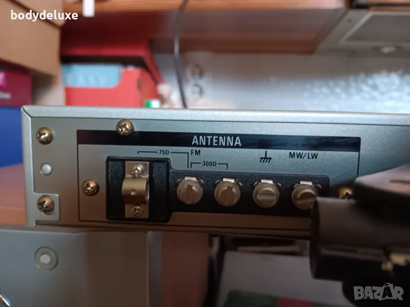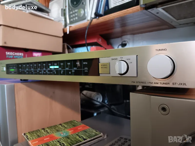A hi-fi AM/FM stereo tuner with an analogue dial housed in a silver metal case. With a rotary tuning control, rotary Band switch (FM, MW, LW), 5 LED signal strength indicators, FM Tuned and Stereo indicators and a Stereo/Muting press button switch. On the rear, an adjustable AM ferrite rod antenna, terminals for AM and FM antennae and RCA phono line output sockets.