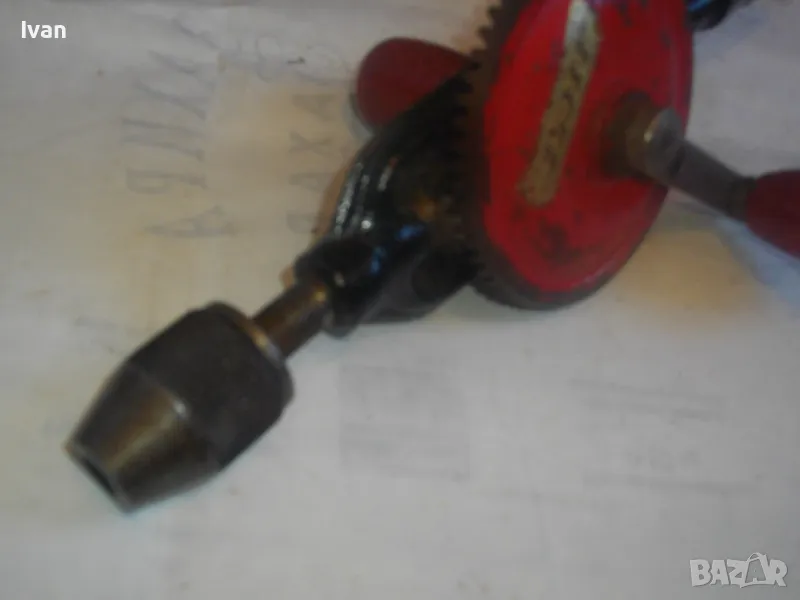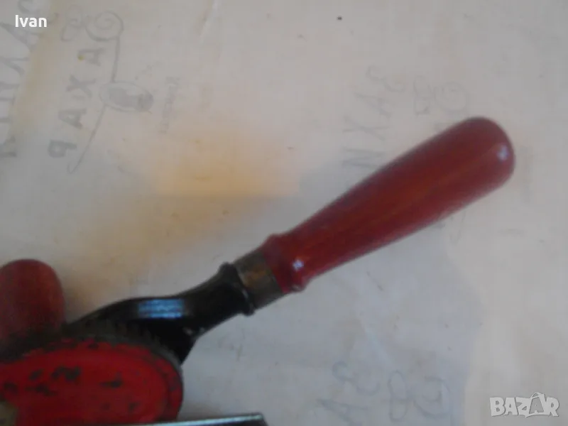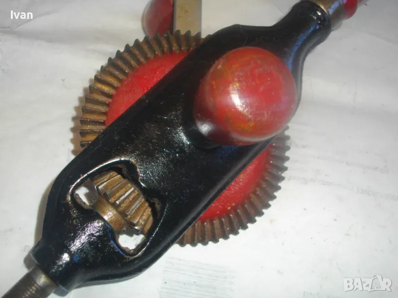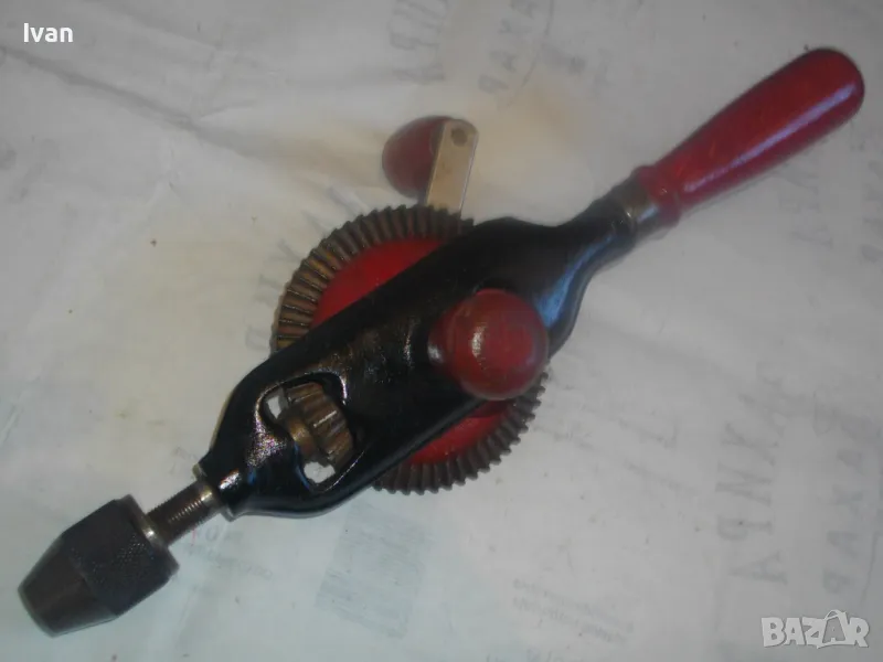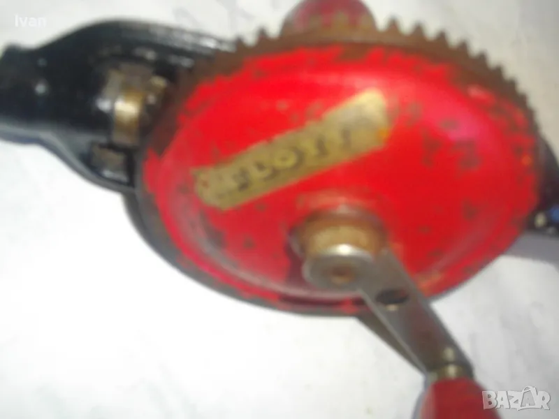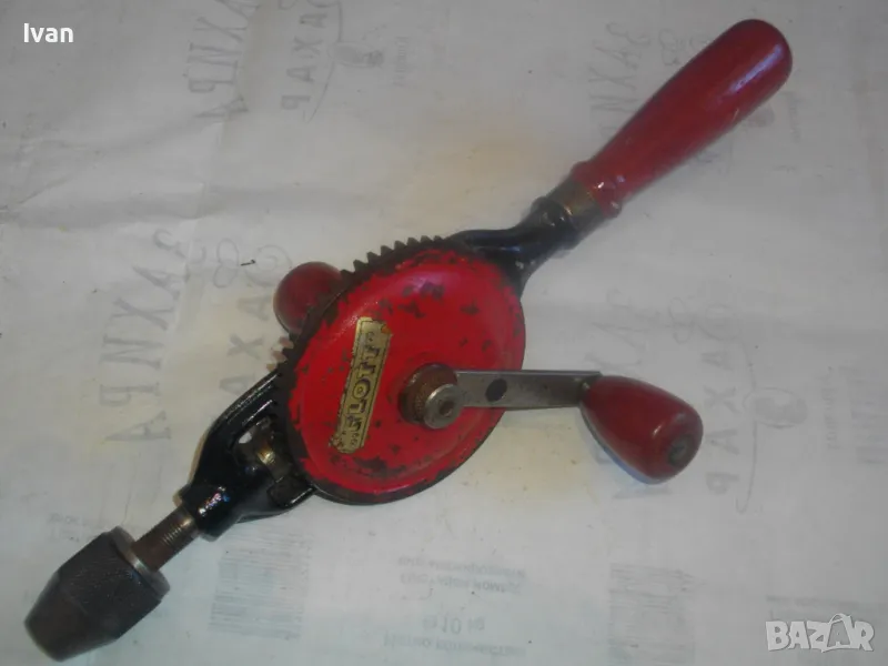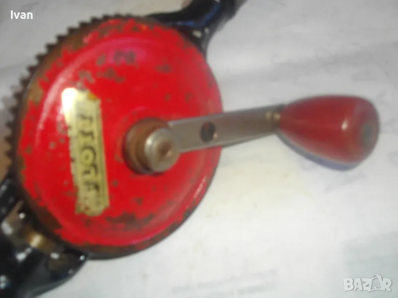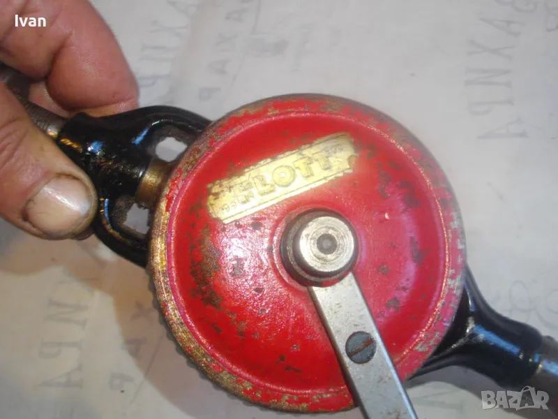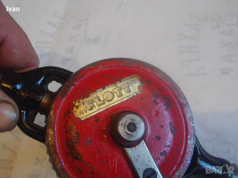 ОПИСАНИЕ на червена ръчна дрелка/маткап - цялостна дължина 320 мм, захват до ф 10 мм. Марка - FLOTT. Година производство - 1999г. Отлично техническо/работно състояние. Немско производство. Дървена дръжка. Ползвана, запазен външен вид, Чугунен корпус.