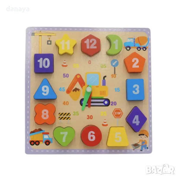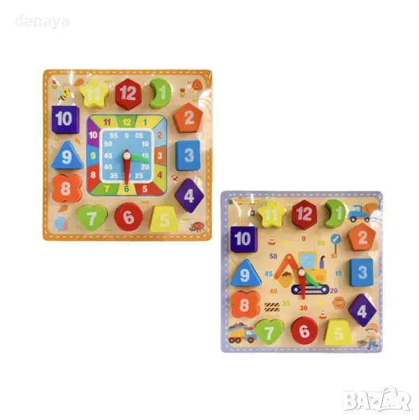 Колко е часът? Чудесна образователна играчка за малките деца. Часовникът съчетава в себе си сортиращ пъзел и часовник, като ще научи децата да познават часа, цветовете и геометричните фигури. Всяка цифра е на различна фигурка и цвят, която си има точно определено място, на което да бъде поставена. Забавна игра, развиваща фината моторика, цветоусещането и познаването на часа.