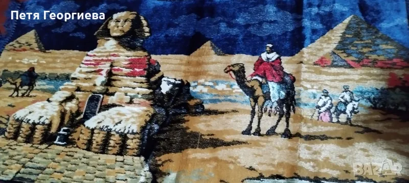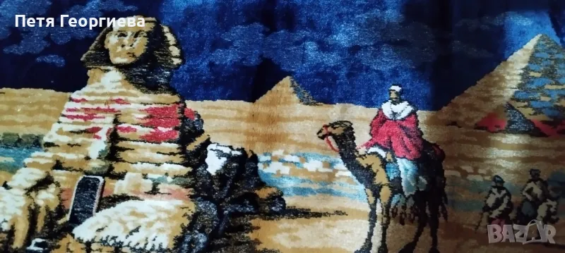 Плюшено килимче (ковьор) с дължина 1 м плюс сини ресни 7 см (от двете страни) и ширина 52 см. Пейзаж от Гиза - голям сфинкс, бедуин на камила 🐫, други бедуини и пирамиди на заден фон.