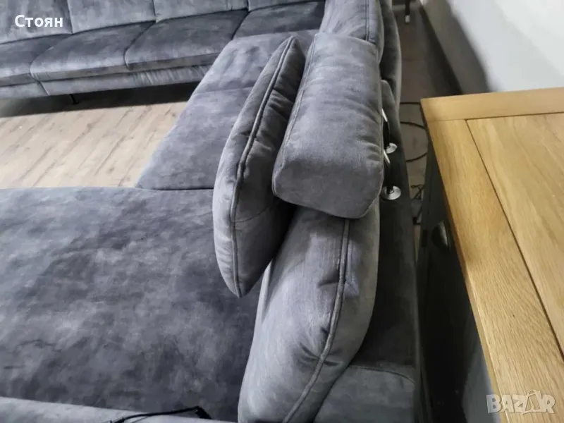 Голям сив П образен ъглов диван от плат с електрическа лежанка и подвижни облегалки "LS701521".