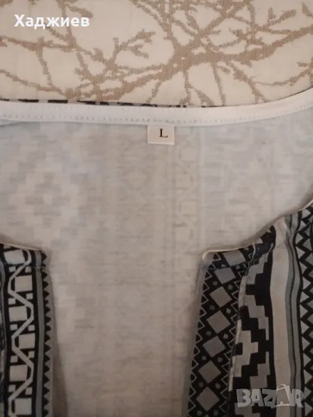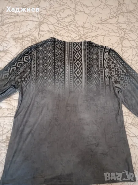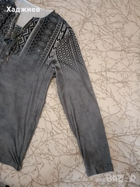 Модерна блуза с дълъг ръкав с шевици по нея. Цвят - сив, дължина 72 см, подмишници - 55 см. Размер L по етикет, но става и за по-голям размер. Дрехата е чисто нова, продава се точно поради несъответствието на номера.