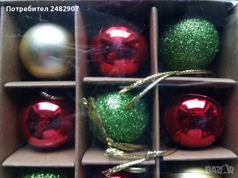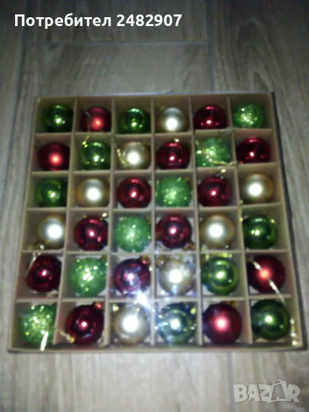 Комплект от 36 броя Коледни играчки - топчета за елха или декорация в червено, зелено и златисто. Диаметър на топчетата - около 2 см, размери на кутията - 19,5/19,5 см. Чисто нови, не са използвани. Цената е за комплекта.
