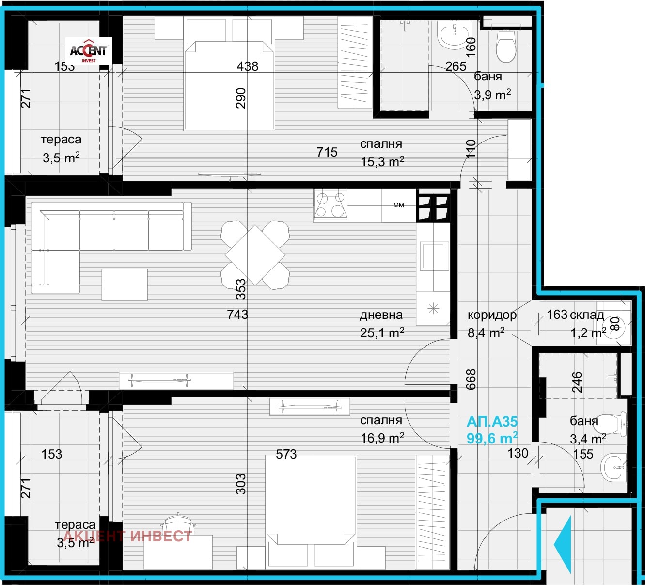 Апартамент А35, блок 3, етаж 8, изложение запад, югозапад; Обща жилищна площ 117,17 кв.м. - коридор, две спални, склад, две тераси, дневна с кухненски кът и 2 бани с тоалет.