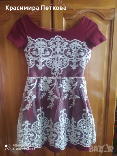 Продавам детска рокля в тъмно/винено червено с пришита отгоре дантела в екрю. Има етикет с размер 8. Според мен е подходяща за 4-5-6 г. Закопчаване със страничен цип.