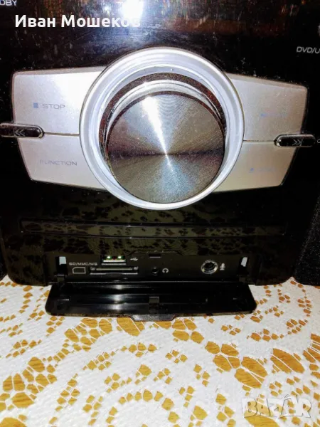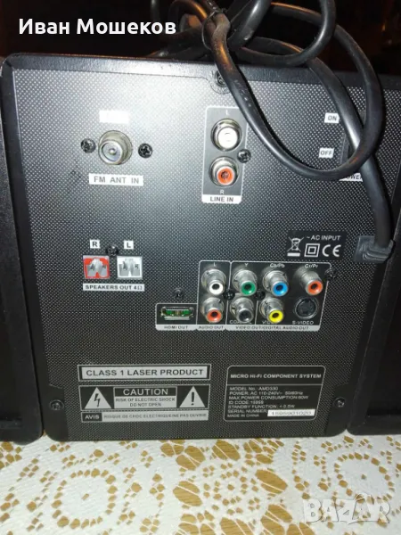 Продавам аудио система AKAI AMD330. Системата е с DVD плейър с HDMI изход. Разполага с MP3 / WMA CD плейър, USB, SD карта, букса за микрофон и за слушалки. Работи само на единия канал. За ремонт или за части. На третата снимка е показан номерът на частта, която трябва да се смени. Забележка: На лявата колона липсва едното задно краче, което не пречи на работата й. Изпращам с Еконт или със Спиди. Цена 50 лв.