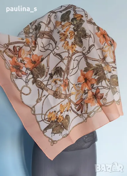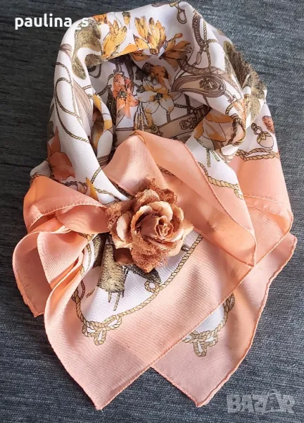 3️⃣. Колаж - Шал във цвят Праскова, кафяво и бяло флорален принт, като нов - цена 24,99лв / 12,5 евро. Ръчна изработка, немачкаем полиестер, уникален.