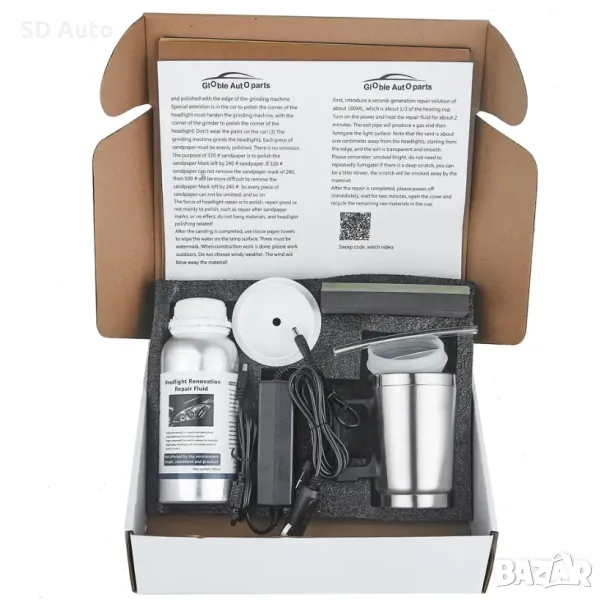 ***Шлaйфането може да премахне повредения слой върху повърхността на фара, причинен от окисление или драскотини, за да изглади повърхността. След това ремонтната течност се нагрява с пулверизатора, така че да покрие повърхността на лампата под формата на пара и да образува ново UV покритие, така че черупката на лампата да стане прозрачна. След ремонт повърхността на фара е гладка, светла, равномерна, безупречна и бързосъхнеща. Оборудването е просто, принципът е прост, лесен за научаване и използване.
