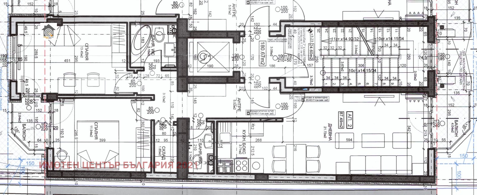 Имотът е с чиста площ от 87.49 кв.м и има следното разпределение: