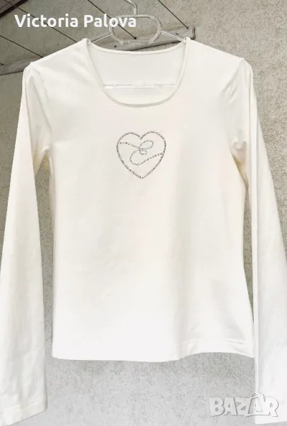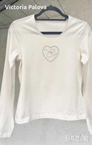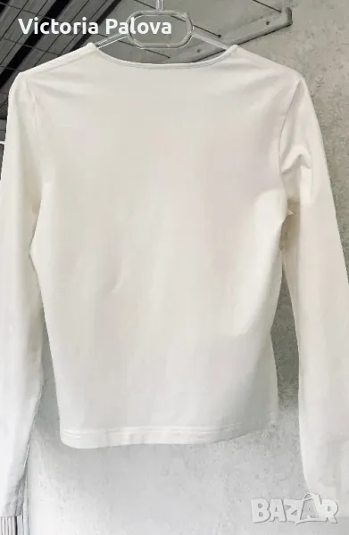 Неупотребявана блуза long sleeve, ненадминато качество и красота - камъчетата с “E” са уникални, красиви и актуални. Цветът е нежен айвъри, екрю или ванилия, блузата има разтегливост. Рамо - 38-40см, ГО - 44см, дължина - 56см, ръкав - 60см.