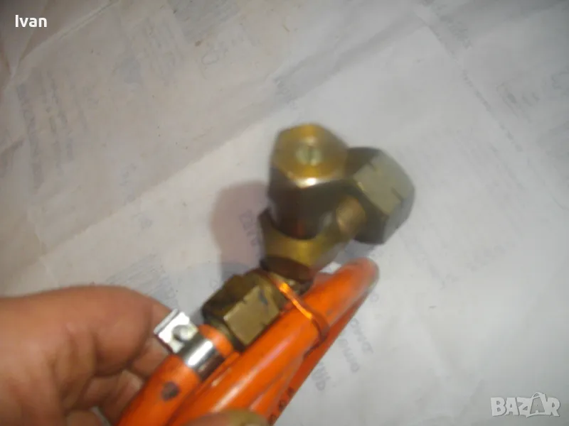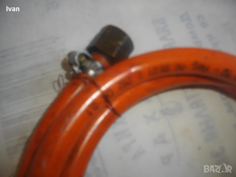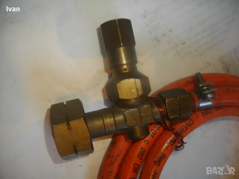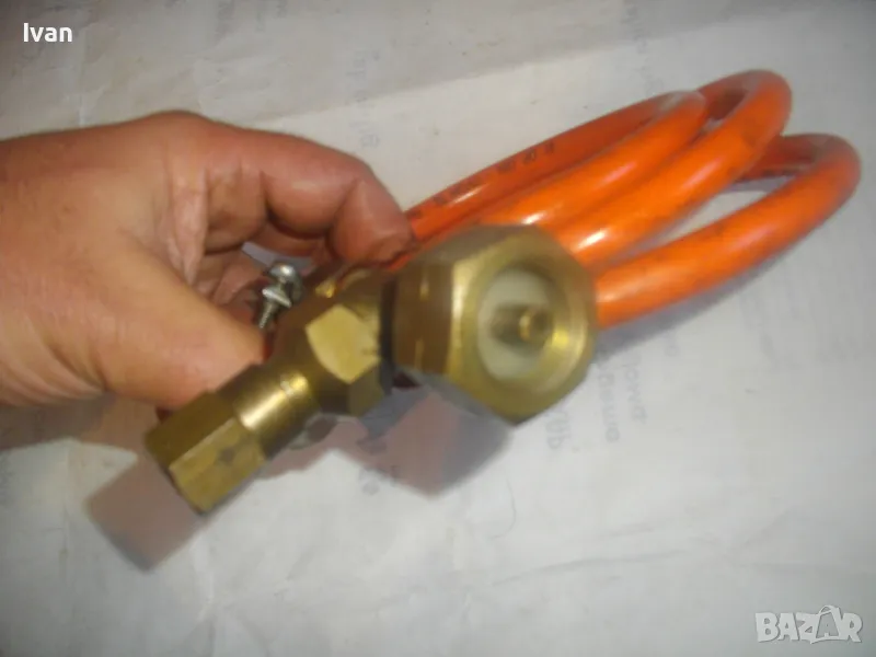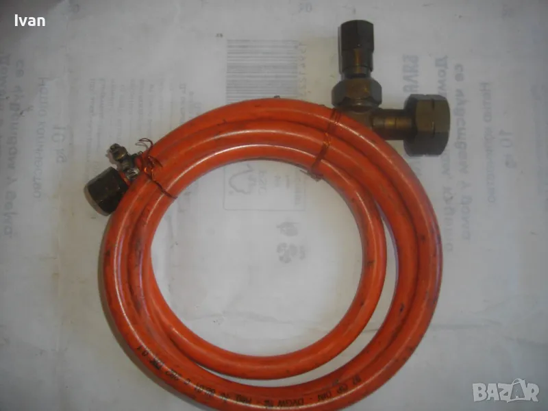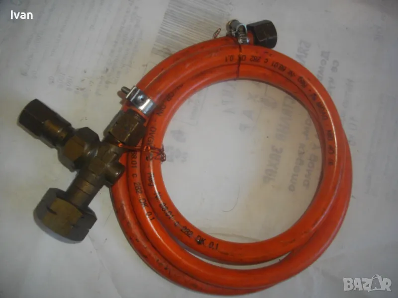 Маркуч за газ пропан-бутан за газова горелка, с поставен клапан налягане вентил - цена 99 лв. Дължина 2 м. Гайка М14 броонзова, скоба стягане. Почти нов, като нов. Маркировка DVGW DK 0,1. На другия край също гайка плюс скоба стягаща. Поставен оригинален клапан налягане вентил старо качество, масивен, бронзов изцяло, с бронзов върток спирателен. Маркуча и вентила са масивни ,от старото качество, без никакви забележк по външно състоняие и работна функционалност.