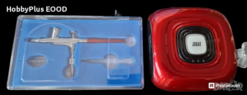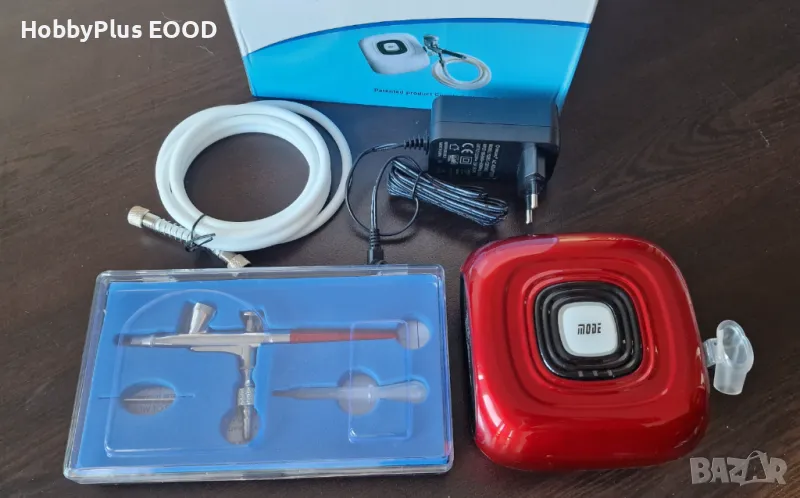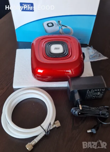 Аерограф с компресор, в пълен комплект, готов за работа. Сипвате боята/лака, включвате и започвате да рисувате.