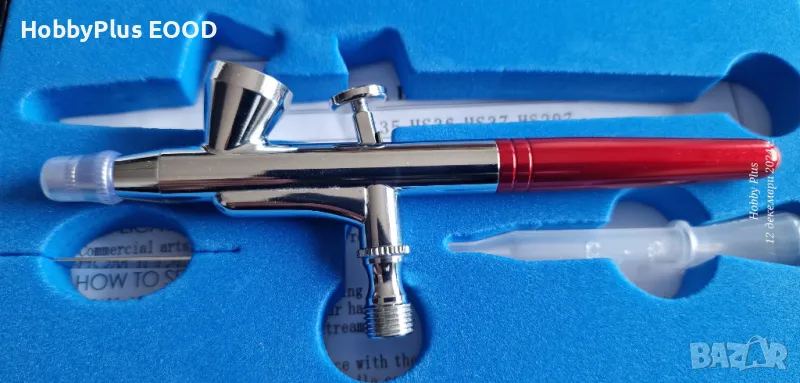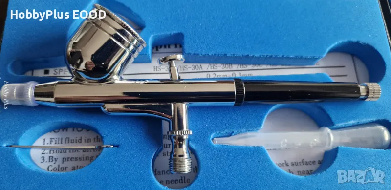 Аерографа е с монтирани на него дюза и игла с размер 0.2мм.